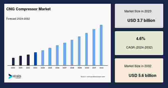 According to StraitsResearch, the global cng compressor market size is valued at USD 3.7 billion in 2023 and is estimated to reach USD 5.6 billion by 2032, growing at a CAGR of 4.6% during 2024-2032.